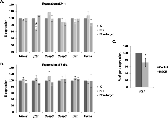 Our results suggested that the increase in the cell growth observed in Dnmt3b-KD cultures is mediated by p53 down-regulation. This prompted us to evaluate the expression level at 24 h and 7 div. of a group of genes related with P53 that participate in pathways either implicated in proliferation (cyclin-dependent kinase inhibitor p21) or in apoptosis (Bax, Puma, Casp6 and Casp8). We also wanted to know if the inhibitor of p53 expression, Mdm2, was responsible of the p53 down-regulation observed in Dnmt3b-KD. As a result, we just observed a decrease in the expression level of p21 (17%) at 24 h (Figure 5A), while at 7 div., no significant changes were detected in any of the analyzed genes (Figure 5B). Therefore, we decided to analyze the expression level of P21 in EPCs from those HSCR patients with a low expression of DNMT3b in comparison with that of controls, and observed a P21 down-regulation (27 %) in EPCs from HSCR patients (Figure 5C).