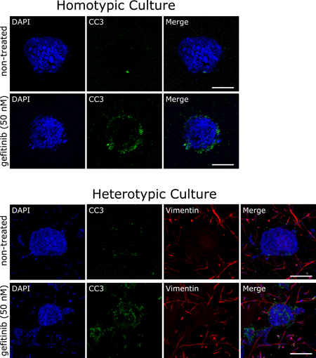 Figure 8: Cancer-associated fibroblasts alter drug responses in vitro. Organoids were generated from the lung adenocarcinoma cell line HCC827, that was cultured in the absence or presence of cancer-associated lung fibroblasts. Homo- and heterotypic cultures of HCC827 cancer cells without or with cancer-associated fibroblasts respectively, were treated with 50 nM gefitinib for 24 hours, processed for immunofluorescence microscopy using cleaved caspase-3 (CC3) and vimentin antibodies and mounted using Vectashield mounting medium containing DAPI. Scale bars: 75 μm.