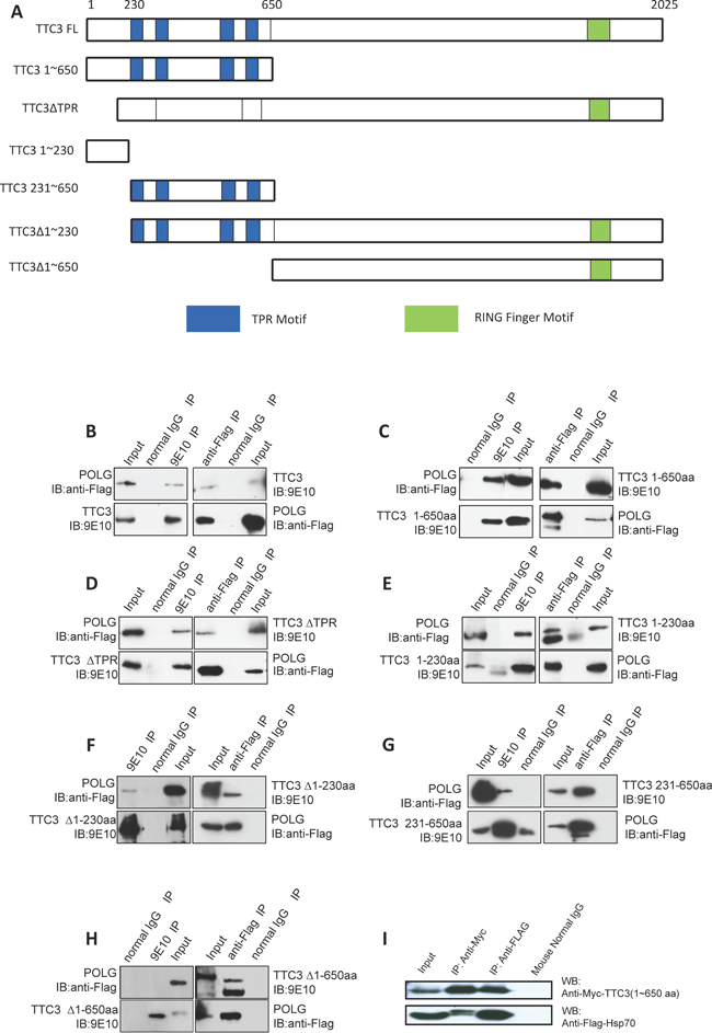 Figure 1: TTC3 proteins interact with POLG and Hsp70. (A) Diagram shows the structure and functional domains of Myc-tagged wild-type TTC3 and subfragments of TTC3 in mammalian expression vectors (pCMV-Myc) used in our study. (B to H) Co-immunoprecipitation experiment. Myc-tagged TTC3 (WT-TTC3 or its subfragments) and 3xFlag-tagged POLG were transfected into 293T cells. TTC3 was immunoprecipitated by Myc antibody (9E10), and POLG was immunoprecipitated by Flag antibody (M2). (I) Co-immunoprecipitation experiment. Myc-TTC3(1~650aa) and Flag-Hsp70 were transfected into 293T cells. TTC3 was immunoprecipitated by Myc antibody (9E10), and Hsp70 was immunoprecipitated by Flag antibody (M2).