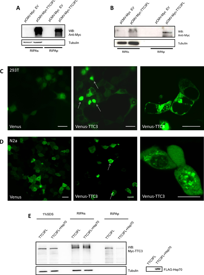 Figure 3: Overexpression of TTC3 forms aggregate structures in cells. (A and B) TTC3 forms RIPA-insoluble components. 293T cells (A) and N2a cells (B) were transfected with pCMV-Myc-TTC3 by TurboFect reagents. The cells were harvested 24 hours after transfection and lysed with RIPA buffer for the RIPA-soluble and -insoluble parts. The RIPA lysates were clarified by centrifugation at 16,000 × g for 20 minutes, and the pellets were sonicated with an equal volume of SDS buffer and dissolved. TTC3 protein occurred in the RIPA-insoluble part. (C and D) 293T (C) and N2a (D) cells were transfected with Venus-TTC3FL (N-terminal Venus-fused TTC3) or Venus. Image recording was performed 48 hours after transfection. Scale bar = 20 μm. (E) Hsp70 improves solubility of TTC3. 293T cells were transfected with FLAG-Hsp70 and Myc-TTC3. Co-transfection with Hsp70 decreased the amount of RIPA-insoluble TTC3 proteins.