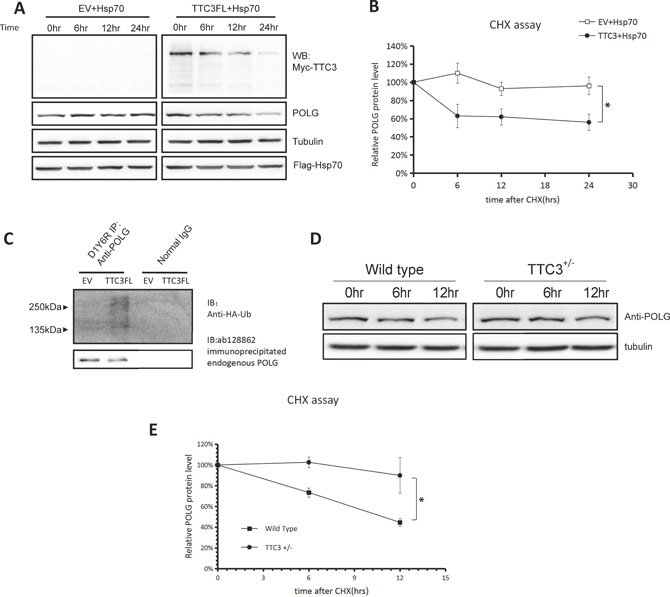 Figure 4: TTC3 facilitates POLG degradation in the presence of co-transfected Hsp70. (A and B) CHX assay. With co-transfected Hsp70, TTC3 increased the POLG degradation rate. Times (hours) are shown after CHX treatment (time 0). Relative intensities were measured using NIH Image J (B). POLG band intensity was normalized to α-tubulin and then normalized to the 0 hour time point. The error bars represent mean ± standard error (SE) (n = 3). *P < 0.05. (C) Endogenous POLG ubiquitination with co-transfected TTC3 and Hsp70. Wild-type TTC3 or pCMV-Myc empty vector was transfected into 293T cells with FLAG-Hsp70 and HA-Ub and resulted in a higher level of endogenous POLG poly-ubiquitination than in the control vector (pCMV-Myc empty vector). (D and E) CHX assay. A reverse experiment knocking out one copy of endogenous TTC3 was performed. The POLG degradation rate was lower in the TTC3+/– MEFs than in the wild-type MEFs. Times (hours) are shown after CHX treatment (time 0). Relative intensities were measured using NIH Image J (E). POLG band intensity was normalized to α-tubulin, and then normalized to the 0 hour time point. The error bars represent mean ± SE (n = 3). *P < 0.05.