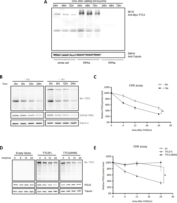 Figure 5: Soluble TTC3 facilitates POLG degradation. (A) We constructed an Myc-TTC3 Tet-on 293T stable cell line. Cells were treated with 1 μg/mL of tetracycline for 24, 48, or 72 hours. The cells were harvested at indicated time points and lysed with SDS buffer for the whole-cell components or lysed with RIPA buffer for the RIPA-soluble and -insoluble parts. The RIPA lysates were clarified by centrifugation at 16,000 × g for 20 minutes, and the pellets were sonicated with an equal volume of SDS buffer and dissolved. The cells expressed Myc-TTC3 steadily and mildly, and TTC3 was primarily RIPA soluble. (B and C) CHX assay. Using a Tet-on stable cell strain, we obtained overexpression of soluble TTC3, which resulted in a faster degradation of POLG. Times (hours) are shown after CHX treatment (time 0). Relative intensities were measured using NIH Image J (C). POLG band intensity was normalized to α-tubulin and then normalized to the 0 hour time point. The error bars represent mean ± standard error (SE) (n = 3). *P < 0.05. (D and E) CHX assay. By reducing the DNA amount of transfected TTC3 plasmids, we obtained overexpression of soluble TTC3, which resulted in faster degradation of POLG. Times (hours) are shown after CHX treatment (time 0). Relative intensities were measured using NIH Image J (E). POLG band intensity was normalized to α-tubulin and then normalized to the 0 hour time point. The error bars represent mean ± SE (n = 3). *P < 0.05.
