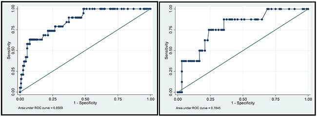 Figure 2: ROC curves in the training group and validation group. In the training group, the C-index = 0.8569, 95%CI [0.779,0.935]. In the validation group, the C-index = 0.7845, 95%CI [0.626,0.943].