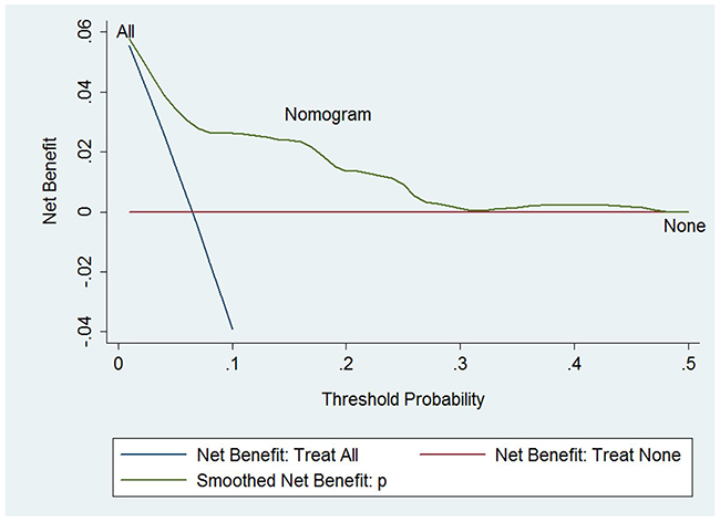 Figure 4: Decision curve analysis. The treatment strategy was superior if it showed the highest value compared to the two simple strategies (i.e., performing screening for all patients (sloping solid line) or no patients (horizontal solid line)). For example, the value of net benefits would be 0.03 if we selected 10% as the cutoff value, suggesting that the nomogram would theoretically identify approximately 3 patients with GCTB lung metastasis among one hundred patients compared with simple observation, without adding any unnecessary tests (false positives).
