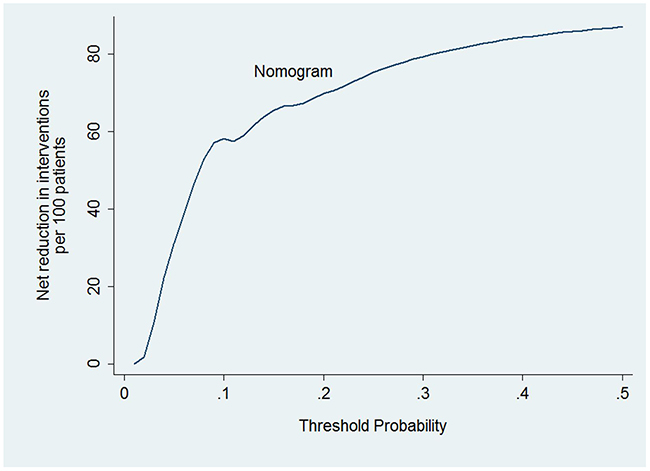 Figure 5: Net reduction. When assessing the clinical utility of the nomogram, we also investigated whether this model would reduce unnecessary lung screening. At the same cutoff of 10%, the nomogram could reduce unnecessary test rates by 58%, without missing any metastasis.
