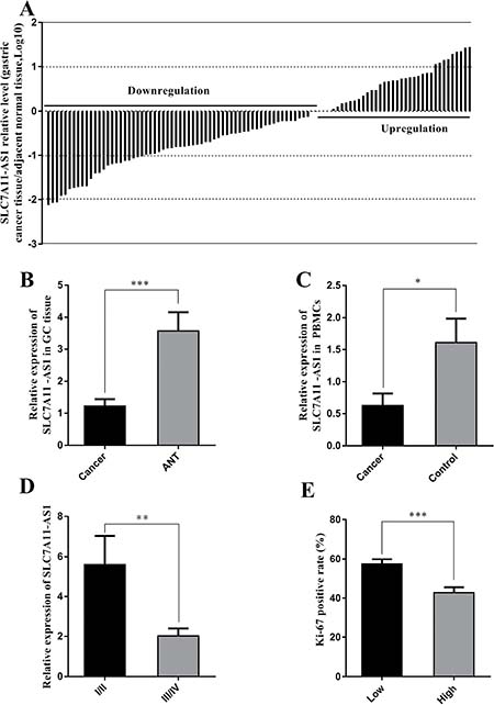 Figure 1: SLC7A11-AS1 expression levels were assessed in human gastric cancer tissues and PBMCs. (A) SLC7A11-AS1 expression was assessed in human GC tissues and paired adjacent noncancerous tissues (ANTs). Bars represent the ratio between expression in GC tissues and ANT (C/N, log scale) from 100 patients was presented. GC tissues express significantly lower levels of SLC7A11-AS1 compared with paired ANTs in the majority of patients (64%). (B) The relative expression levels of SLC7A11-AS1 in GC tissues was significantly lower than those in ANTs (P < 0.001, N = 100). (C) The relative expression levels of SLC7A11-AS1 in 33 GC patients’ PBMCs was significantly lower than those in 20 healthy controls (P = 0.011). (D) SLC7A11-AS1 expression level was down-regulated in the stage III/IV GC tissues compared with the stage I/II GC tissues (P = 0.003). (E) Ki-67 positive rate was higher in the SLC7A11-AS1 low expression group (N = 48) than that in the SLC7A11-AS1 high expression group (N = 22) (P < 0.001). Expression levels were normalized to β-actin levels. Results are shown as mean ± SEM. (*P < 0.05, **P < 0.01, ***P < 0.001, two-tailed Student’s t-test).