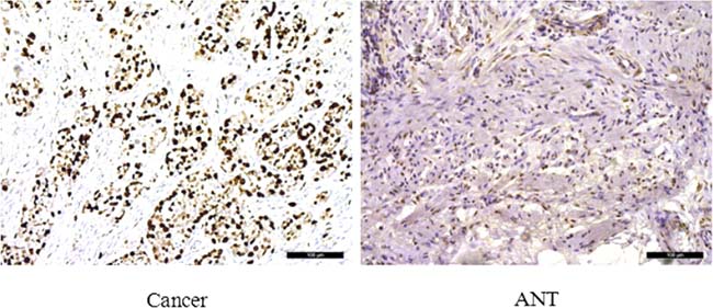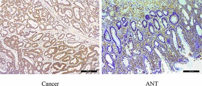 Figure 5: Immunohistochemical staining of SLC7A11 in pairs of representative gastric cancer tissues with adjacent non-tumorous tissues (ANT). Marked SLC7A11 expression was observed in GC. SLC7A11 was mainly found in the membrane of the carcinoma cells. High expression of SLC7A11 in GC tissues compare with ANTs (200×). Scale bars, 100 mm.