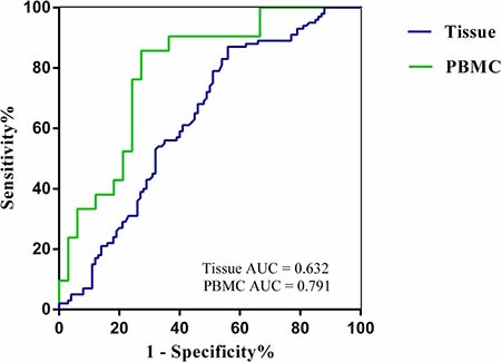All statistical data were analyzed with Statistical Program for Social Sciences (SPSS) 13.0 software (SPSS, Chicago, IL) and GraphPad Prism 6.0 (GraphPad Software, La Jolla, CA). The differences between groups were analyzed using Student’s t-test, Chi-Square test or the Fisher Exact test. Logistic regression analyses were done with 95% confidence interval and were performed by using the univariate and multivariate model to identify factors associated with tumor proliferation. A receiver operating characteristic (ROC) curve was established to evaluate the diagnostic value in cancer tissues and PBMCs. Spearman correlation analyses were performed to investigate correlations between gene expression levels. All the tests were two-tailed, and P < 0.05 was considered statistically significant.
