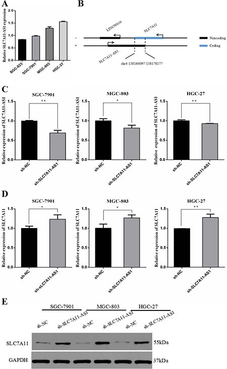 LncRNAs exhibit distinct expression patterns in tissues; however, we have limited knowledge of their precise molecular roles during mammalian development. To identify gastric cancer-relevant lncRNAs, the expression profiles of lncRNAs (Supplementary Figure 1A) and coding transcript mRNAs (Supplementary Figure 1B) were detected by microarray. A total of 4643 lncRNAs with a significant differential expression change of more than two-fold were identified: 2617 up- and 2026 down-regulated. A total of 3,944 coding transcript mRNAs that were differentially expressed by more than two-fold were identified: 1,948 mRNAs were up-regulated, and 1,996 mRNAs were down-regulated. We further analyzed the combined of the data concerning lncRNAs and mRNAs, based on lncRNA neighboring differential coding transcripts of mRNA expression profiles. We focused on the antisense lncRNA SLC7A11-AS1 (Supplementary Figure 2) and the neighboring sense coding transcript mRNA SLC7A11 (Supplementary Table 2) because the levels of SLC7A11 (located approximately 300 kb downstream of the lncRNA locus) were significantly changed.