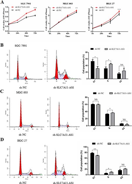 Figure 7: SLC7A11-AS1 low expression promotes gastric cancer cells proliferation and causes G1/S progress. (A) The function of SLC7A11-AS1 on cell proliferation was determined by CCK8 assay. Cell proliferation was increased after knocked down SLC7A11-AS1 in SGC-7901 (P < 0.001), MGC-803(P = 0.046) and HGC-27(P < 0.001) cells. (B–D) The function of SLC7A11-AS1 on cell cycle was measured by flowcytometry after PI staining in SGC-7901, MGC-803 and HGC-27 cells. Error bars suggest mean ± SEM. (*P < 0.05, **P < 0.01, ***P < 0.001, NS: No significantly).