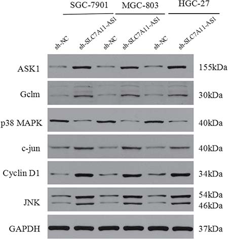 Figure 9: The protein of cyclin D1, ASK1, Gclm, p38, c-Jun and JNK were changed after knocking down SLC7A11-AS1 with specific shRNA or negative control shRNA. The ASK1, Gclm,, c-Jun, cyclin D1 and JNK protein levels were up-regulated and p38 protein level was down-regulated in SGC-7901, MGC-803 and HGC-27 cells after knocking down SLC7A11-AS1, expression levels were normalized to GAPDH levels.