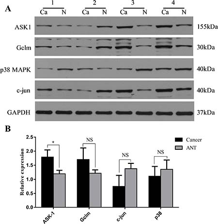 Figure 10: Expression changes of ASK1, Gclm, c-Jun and p38 were assessed in human SLC7A11-AS1low gastric cancer tissues. (A) The protein level of ASK1, Gclm and c-Jun were increased and p38MAPK was decreased in 30 paired SLC7A11-AS1low GC tissues compared with ANTs, expression levels were normalized to GAPDH levels. (B) The expression of ASK1 (P = 0.027) and Gclm (P = 0.217) mRNA level were up-regulated and p38 (P = 0.638) and c-Jun (P = 0.193) mRNA levels were down-regulated in 30 paired SLC7A11-AS1low group GC tissues and respective ANTs. Expression levels were normalized to β-actin levels. Results are shown as mean ± SEM. (*P < 0.05, NS: No significantly, Ca: cancer tissue, N: respective ANTs, two-tailed Student’s t-test)