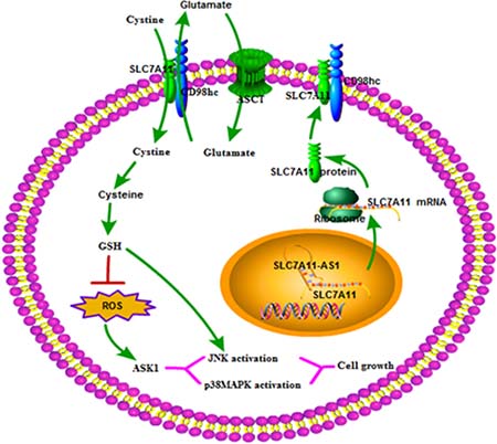 Figure 11: The role of the SLC7A11-AS1–SC7A11 model interacts in tumor development. Decreased expression of SLC7A11-AS1 is increases GSH levels within cells by up-regulating SLC7A11 expression. The resultant increase in cellular GSH levels activates ASK1-p38MAPK/JNK signaling in cancer cells, thereby promoting tumor development. ASCT, system ASC glutamine transporter.