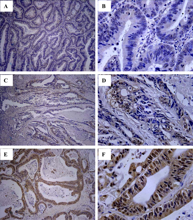 Figure 1: Immunohistochemistry analysis of HLA-G expression in primary CRC lesions. Representative staining of negative (A and B), and positive expression (C and D; E and F) of HLA-G in CRC lesions. Original magnification: A, C, E (100×) and B, D, F (400×).