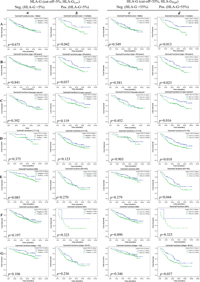 Finally, our data showed that HLA-GHigh status was powerful in affecting the patient survival when clinical parameter was stratified. Among female patients, the elder patients, colon carcinoma patients, stage of T3+4, N1+2, and stage III+IV whose HLA-G expression above the cut-off 55% (HLA-GHigh) have dramatically poor survival than those with lower HLA-G expression. In serous ovarian carcinoma, a study by Andersson et al. [14] revealed that HLA-G expression was correlated to a significant worse prognosis in patients with the genotype HLA-A*02. These data indicated that HLA-G expression status together with other clinical parameters, tumor microenvironment factors is possible to discriminate subpopulations and identify patients with even worse prognosis.