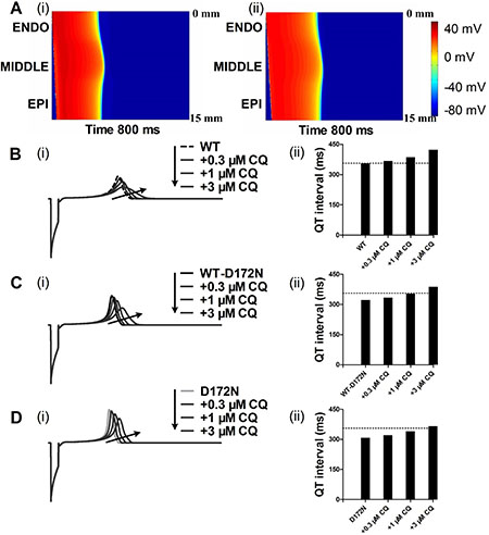 Figure 5: Dose-dependent effects of CQ on the pseudo-ECG of a 1D transmural strand in the WT, WT-D172N and D172N conditions. (A) Excitation prolongation across a 1D transmural strand model for the WT-D172N (i) simulations at 3 μM concentration of CQ (ii). Space runs from the top (ENDO, 0 mm) to the bottom (EPI, 15 mm). Time runs from the left (0 ms) to the right (800 ms). The corresponding pseudo-ECGs derived from the propagating electrical excitation wave. (B) Superimposed pseudo-ECGs (i) for the WT simulations at the indicated concentrations and the corresponding QT interval histogram (ii). (C) Superimposed pseudo-ECGs (i) for the WT-D172N simulations at the indicated concentrations and the corresponding QT interval histogram (ii). (D) Superimposed pseudo-ECGs (i) for the WT simulations at the indicated concentrations and the corresponding QT interval histogram (ii).