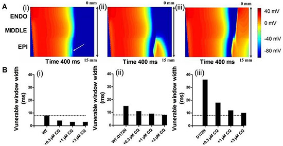 Figure 8: Simulated vulnerable window by using a 1D transmural strand model for the WT, WT-D172N, and D172N simulations at the indicated CQ concentrations. (A) Space-time plot of excitation propagation and response of a 1D transmural strand to a test stimulus. APs are mapped into a colour spectrum ranging from –85 ms to 45 mV. Space runs from top (ENDO) to bottom (EPI). Time runs from left (0 ms) to the right (400 ms). The premature stimulus applied at EPI part at 320 ms, bi-directional block (i); 340 ms, unidirectional conduction block (ii); and 350 ms, bi-directional conduction (iii). (B) The vulnerability of the tissue for the WT (i), WT-D172N (ii), and D172N (iii) simulations at the indicated CQ concentrations.