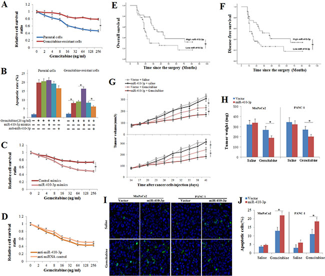 Figure 2: Association of miR-410-3p expression with the sensitivity to gemcitabine and the prognosis. Growth-inhibitory effects (A) of gemcitabine on gemcitabine-resistant and parental clones of human PDAC cells were assessed by MTT assay. The apoptotic rate (B) of human PDAC cells (annexin V/PI double-positive cells) treated with 50 ng/ml gemcitabine were analyzed by FCM assay, and the growth-inhibitory effects of gemcitabine on gemcitabine-resistant clones of human PDAC cells treated with miR-410-3p mimics (C) and anti-miR-410-3p (D) were assessed by MTT assay. PDAC patients were divided into a low miR-410-3p expression group and high miR-410-3p expression group, according to the real-time PCR results. OS (E) and DFS (F) curves of PDAC patients with low or high miR-410-3p expression were drawn with the log-rank test. Human PDAC cells (MiaPaCa2 cell and PANC-1 cell) expressing miR-410-3p or a control vector were subcutaneously transplanted in mice. Mice were treated with gemcitabine or saline (n = 11~20). Tumor volume (G) and tumor weight (H) were measured. The number of apoptotic cells in the tumor specimens was determined using TUNEL staining (I). The TUNEL kit stained apoptotic cells green, while the nuclei were stained blue using DAPI. The rate of apoptosis (J) was determined by counting the TUNEL-stained cells in the specimen. All of the treatments in this figure were carried out in triplicate, and the results are displayed as the means ± SD. *P < 0.05.