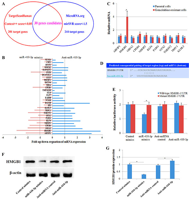 Figure 3: Predicting and validating the gene targets of miR-410-3p. (A) Online programs (TargetScanHuman 7.1 and MicroRNA.org) predicted putative gemcitabine resistance-related target genes of miR-410-3p. TargetScanHuman identified 201 target genes (Context++ score < –0.05), and MicroRNA.org identified 244 target genes (mirSVR score < –1.5). Thirty gene candidates were designated putative target genes of miR-410-3p by both programs. (B) The expression of the 30 putative target genes was determined by real-time PCR in human PDAC cells transfected with miR-410-3p mimics or anti-miR-410-3p. (C) The expression of 11 potential targets (ARFIP1, HMGB1, GRIA2, CPEB4, NDFIP2, KLF6, PARG, OTX2, TMEFF2, TRPC1 and KLHL5) was determined by real-time PCR in gemcitabine-resistant and parental clones of human PDAC cells. (D) Predicted miR-410-3p binding sites in the 3′-UTR of HMGB1. (E) Luciferase reporter assay with co-transfection of wild-type or mutant HMGB1 and miR-410-3p mimics, anti-miR-410-3p, mimics-control or anti-miRNA-control in human PDAC cells. (F, G) Western blot analysis of HMGB1 expression in gemcitabine-resistant clones of human PDAC cells transfected with miR-410-3p mimics, anti-miR-410-3p, mimics-control or anti-miRNA-control. All of the treatments in this figure were carried out in triplicate, and the results are displayed as the means ± SD. *P < 0.05.
