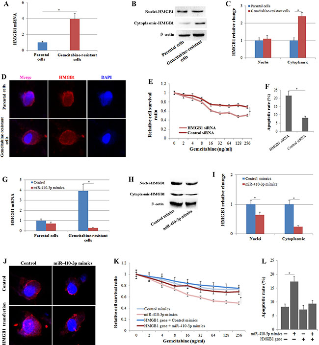 Figure 4: The expression and translocation of HMGB1 correlates with gemcitabine resistance in human PDAC cells. HMGB1 expression was determined by real-time PCR (A), Western blot (B) and immunofluorescence (D) in gemcitabine-resistant and parental clones of human PDAC cells. (C) The relative change in nuclear and cytoplasmic HMGB1 expression was quantified in gemcitabine-resistant clones of human PDAC cells relative to that in parental clones.Growth-inhibitory effects (E) and the apoptotic rate (annexin V/PI double-positive cells) (F) of gemcitabine on gemcitabine-resistant PDAC cells treated with or without HMGB1 siRNA were assessed by MTT assay and FCM assay, respectively. (G) HMGB1 expression was determined by real-time PCR in gemcitabine-resistant and parental clones of human PDAC cells treated with or without miR-410-3p mimics. HMGB1 expression was determined by Western blot (H) and immunofluorescence (J) in gemcitabine-resistant clones of human PDAC cells treated with or without miR-410-3p mimics and/ or HMGB1 gene transfection. The relative change in nuclear and cytoplasmic HMGB1 expression (I) was quantified relative to that in clones treated with mimics-control. Growth-inhibitory effects (K) and the apoptotic rate (annexin V/PI double-positive cells) (L) of gemcitabine on gemcitabine-resistant PDAC cells treated with or without miR-410-3p mimics and/or HMGB1 gene transfection were assessed by MTT assay and FCM assay, respectively. All of the treatments in this figure were carried out in triplicate, and the results are displayed as the means ± SD. *P < 0.05.