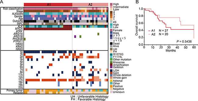 Figure 3: Genetic and clinical characteristics of group A (ALK mutation/amplification) (A) Landscape of genetic lesions in group A including 47 neuroblastomas with ALK mutation/amplification. According to the MYCN status, group A can be divided into the following 2 subgroups: group A1 (ALK abnormalities with MYCN amplification) and group A2 (ALK abnormalities without MYCN amplification). (B) Overall survival of neuroblastoma patients in groups A1 and A2.