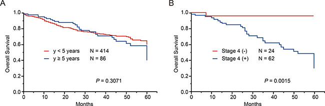 Figure 4: Overall survival of 500 neuroblastoma patients according to age at diagnosis and stages. Overall survival according to age at diagnosis in neuroblastoma patients (A) and overall survival according to stage4 or non-stage4 in neuroblastoma patients older than 5 years (B).