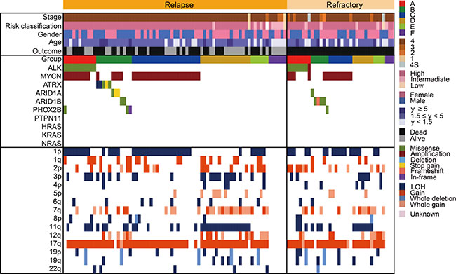 Figure 7: Comparison of the genetic and clinical landscape between 75 relapsed cases and 36 refractory cases. Mutational and copy number change profiles of relapsed cases and refractory cases among 111 neuroblastomas.