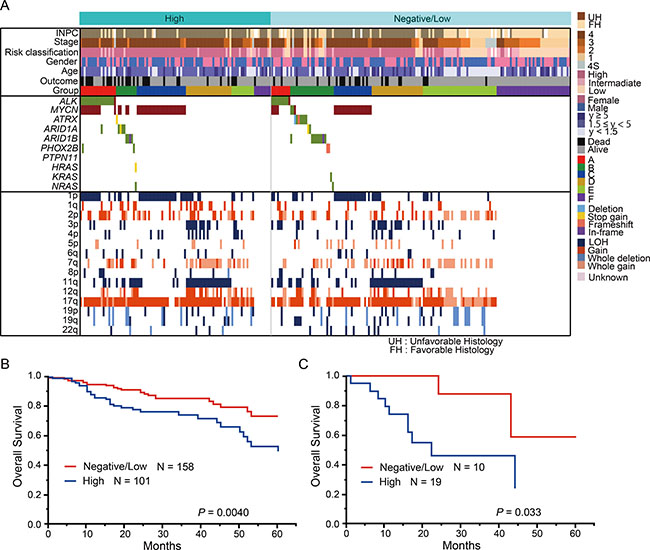 Figure 9: Genetic and clinical characteristics of the high and low ALK score groups. (A) Genetic landscape of 259 neuroblastomas based on the ALK score. (B) Kaplan–Meier estimate for overall survival according to the ALK score. (C) Kaplan–Meier estimate for overall survival according to the ALK score in group A.