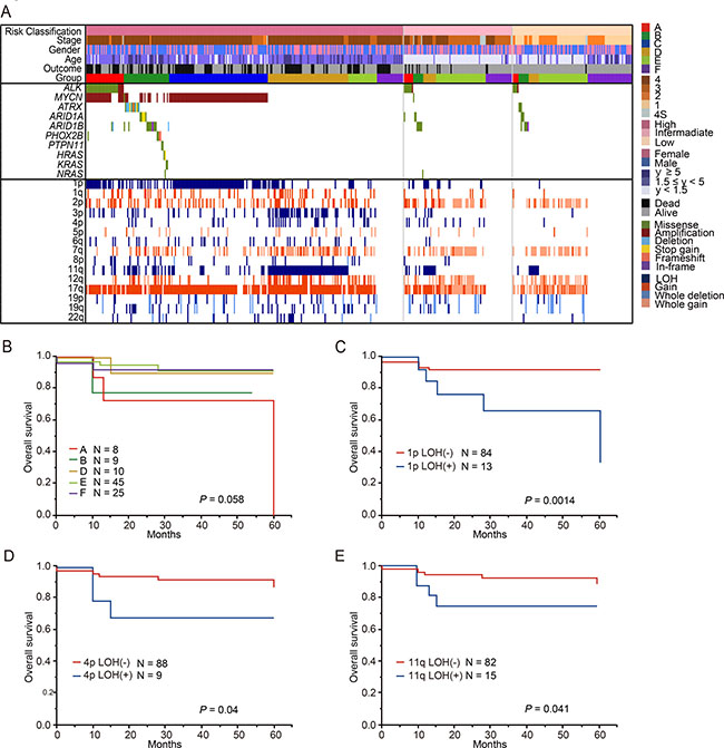 During the last several decades, a body of literature regarding risk-based therapy for children with neuroblastoma has been accumulated [2]. Clinical stage, age, histopathology, MYCN copy number status, 11q LOH, and DNA ploidy are important for risk assessment in patients with neuroblastoma [27–31]. However, stratification is still imperfect, resulting in the under-treatment of few cases with intermediate risk. This may be due to the lack of systematic molecular characterization in this patient group of neuroblastoma. In our cohort, 97 cases were classified into the intermediate-risk group of COG risk classification, and we assessed the genetic features of these cases. In this intermediate-risk group, the proportion of patients in group E was the highest (46.4%), while the proportions of patients in groups A, B, and D were relatively low (8.2%, 9.3%, and 10.3%, respectively). To identify patients who might benefit the most from genetic alteration-based risk estimation, we analyzed the prognostic value of genetic changes in the intermediate-risk group (Figure 10A). There were no relationship between genetic subgroups and overall survival in patients with intermediated-risk group (Figure 10B). Intriguingly, in addition to 11q LOH (P = 0.041), 1p LOH and 4p LOH were significantly related to poor outcome (P = 0.0014 and P = 0.04, respectively) (Figure 10C–10E), although multivariate analysis did not show statistical significance (Supplementary Table 11).
