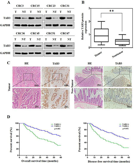Figure 1: High TAB3 expression is associated with a poor prognosis in CRC patients. (A) Representative Western blot analysis of TAB3 protein expression (T: tumor, NT: non-tumor tissues). (B) Quantification of TAB3 protein expression using Western blot analyses in 68 paired CRC and their adjacent non-tumor tissues. GAPDH protein expression was used as an internal control (**P < 0.01). (C) IHC showed that TAB3 protein levels were increased in CRC tissues (magnification: 100×, inset magnification: 400×). (D) Kaplan-Meier survival curves for 162 CRC patients. Patients with high TAB3 protein expression levels showed significantly poorer overall survival and disease-free survival than patients with low TAB3 protein expression (both P < 0.001, log-rank test).