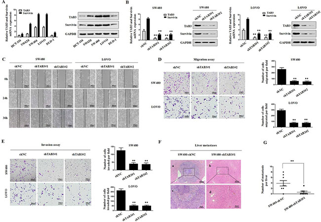 Figure 2: Stable knockdown of TAB3 reduced Survivin expression and inhibited CRC invasion and metastasis in vitro and in vivo. (A) qRT-PCR and Western blot analyses of TAB3 and Survivin expression in the indicated CRC cell lines. (B) Western blot analyses were used to detect TAB3 and Survivin expression in SW480 and LOVO cells stably transfected with shNC, shTAB3#1 and shTAB3#2. (C) Wound healing assay. Wound closure was delayed in stable TAB3-knockdown cells compared with the shNC control at both the 24- and 36-h time points. Magnification, ×100. (D) Transwell migration assays of SW480 and LOVO cells with TAB3 expression stably inhibited (**p < 0.01). Magnification, ×100. (E) Transwell invasion assays of SW480 and LOVO cells treated with shNC, shTAB3#1 and shTAB3#2. Magnification, ×100. (F) Representative H&E staining of livers from the SW480-shNC and SW480-shTAB3 #1 groups. Magnification: a and b, ×100; c and d, ×400. (G) (n = 8; **P < 0.01).
