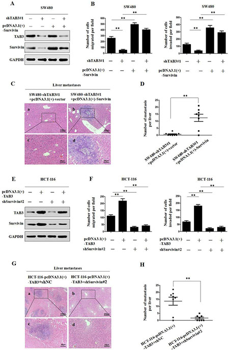 Figure 3: TAB3 promotes CRC invasion and metastasis by upregulating Survivin expression. (A) The upregulation of Survivin attenuated the loss of Survivin expression in SW480-shTAB3 cells. (B) Transwell assays showed that the upregulation of Survivin significantly rescued cell migration and invasion in SW480-shTAB3 cells (**P < 0.01). (C) Representative H&E staining of livers from the SW480-shTAB3#1 +pcDNA3.1(+)-vector and SW480-shTAB3#1 +pcDNA3.1(+)-Survivin groups is shown. Magnification: a and b, ×100; c and d, ×400. (D) (n = 8; **P < 0.01). (E) Protein levels of TAB3 and Survivin were detected by Western blot analysis. The knockdown of Survivin expression dramatically inhibited the increase of Survivin expression in HCT116-TAB3 cells. (F) Transwell assays showed that Survivin inhibition reduced TAB3-enhanced cell migration and invasion (**P < 0.01). (G) Representative H&E staining of livers from the HCT116-TAB3+shNC and HCT116-TAB3+shSurvivin#2 groups is shown. Magnification: a and b, ×100; c and d, ×400. (H) (n = 8; **P < 0.01).