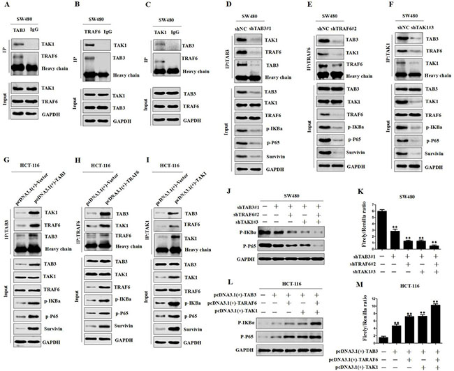 Figure 5: TAB3, TRAF6 and TAK1 are involved in NF-κB activation. (A–C) co-IP among endogenous TAB3, TAK1 and TRAF6 in SW480 cells. (D–I) co-IP and Western blot analysis showing the levels of TAB3, TAK1 and TRAF6 after silencing or overexpression and their effects on TAB3, TAK1 and TRAF6 interaction and the NF-κB pathway in CRC cells. (J–K) Western blot and Luciferase analysis showing the levels of TAB3, TAK1 and TRAF6 after silencing and their effects on p-IKBa and p-P65 expression and NF-κB activity in SW480 cells (**P < 0.01). (L–M) Western blot and Luciferase analysis showing the levels of TAB3, TAK1 and TRAF6 after overexpression and their effects on p-IKBa and p-P65 expression and NF-κB activity in HCT-116 cells (**P < 0.01).