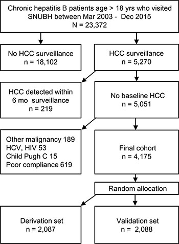 This single center retrospective cohort study enrolled consecutive CHB patients who were over age eighteen and underwent regular surveillance for HCC between Mar. 2003 and Dec. 2015 in a tertiary referral center in South Korea. Clinical and laboratory data were retrieved from the liver disease registry of Seoul National University Bundang Hospital Clinical Data Warehouse [40, 42]. Patients with detection of HCC within 6 months after initial screening, malignancy other than HCC, hepatitis C virus or human immunodeficiency virus coinfection, Child-Pugh class C or non-compliance of surveillance were excluded (Figure 1).