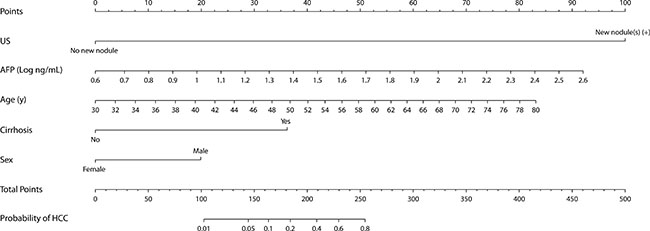 In conclusion, a nomogram composed of age, sex, presence of cirrhosis, serum AFP levels and US findings better predicts the probability of presence of HCC compared to US-only screening in CHB on surveillance. HCC nomogram-based screening has superior performance compared to US-only screening and cost-effective. The clinical usefulness of HCC nomogram-guided surveillance strategy needs to be validated in prospective studies.