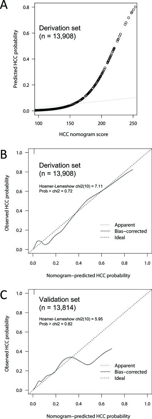 A nomogram was established from the independent predictors of the logistic model. The endpoint of the nomogram was detection of HCC at the time of US examination. The HCC nomogram score, the point sum of each parameter, was tested for calibration and discrimination [22, 45]. Calibration of the nomogram was evaluated for correct detection of HCC by calibration curves and Hosmer-Lemeshow goodness-of-fit test [46]. The discriminative ability was assessed by the receiver operating characteristic (ROC) curve analysis with comparison of concordance (C) statistic [47].