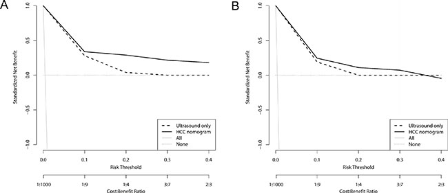 Figure 4: Decision curve analysis for HCC screening models. Decision curves for derivation set (A) and validation set (B). Ultrasound-only indicates traditional US-based screening in which decisions to request confirmatory tests are guided only by positive US tests. HCC nomogram indicates that the decisions are guided by HCC nomogram scores. Risk threshold and cost:benefit ratio indicate the relative significance of correct detection of HCC to correct exclusion of HCC of the models. All indicates that all CHB patients receive confirmatory tests, i.e. dynamic imaging studies or biopsy, and None indicates that no patients receive confirmatory tests. The net benefit of HCC nomogram was higher than that of US-only across given range of threshold probabilities, indicating that nomogram-based screening model would produce cost-effective clinical outcome irrespective of patient preference.