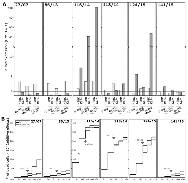 Figure 7: Induction of dormancy- and stemness-associated genes during TMZ treatment in GBM primary cultures, and determination of TMZ-induced and combined TMZ / AT101-induced cytotoxicity. Primary cultures were stimulated with 500 μM TMZ, 5 μM AT101 or 0.2% DMSO (control) for up to 10-12 days. 5 μM AT101 was added to TMZ stimulated cells at day 6, and stimulation was performed for additional 4-6 days. (A) Expression of H2BK and KLF4 was checked at days 6 and 10 using qRT-PCR, and (B) numbers of dead cells were determined at days 3-6-8-10-12 and documented as n-fold cytotoxic effects.