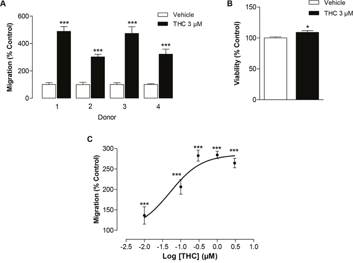Figure 1: Impact of THC on the migration of MSCs. (A) Interdonor variability of THC’s effect on migration in Boyden chamber assays. MSCs from 4 different donors were incubated with 3 μM THC or vehicle for 6 h. (B) Modulation of cellular viability by THC. MSCs were incubated with 3 μM THC or vehicle for 6 h and the viability was analyzed by WST-1 test. (C) Concentration-dependent effect of THC on the migration of MSCs in the Boyden chamber assay. Data are expressed as percentage of vehicle-treated controls (set as 100%) and represent means ± SEM of n = 4 (A, C) or n = 4-8 (B) incubations with cells from 1 donor. *P < 0.05, ***P < 0.001 vs. corresponding vehicle control, Student’s t test.