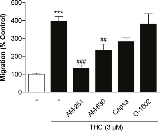 Figure 2: Involvement of cannabinoid-modulated receptors in the promigratory effect of THC on MSCs. Cells were pretreated for 1 h with AM-251 (CB1 antagonist), AM-630 (CB2 antagonist), capsazepine (Capsa, TRPV1 antagonist) or O-1602 (agonist at GPR55) at 1-μM concentrations prior to stimulation of cells with vehicle or 3 μM THC. Migration was analyzed after a 6-h stimulation period in Boyden chamber assays. Data are expressed as percentage of vehicle-treated controls (set as 100%) and represent means ± SEM of n = 16 incubations with cells from 4 donors (4 incubations per donor). ***P < 0.001, vs. vehicle control; ##P < 0.01, ###P < 0.001 vs. THC-treated cells, one-way ANOVA plus post hoc Bonferroni test.