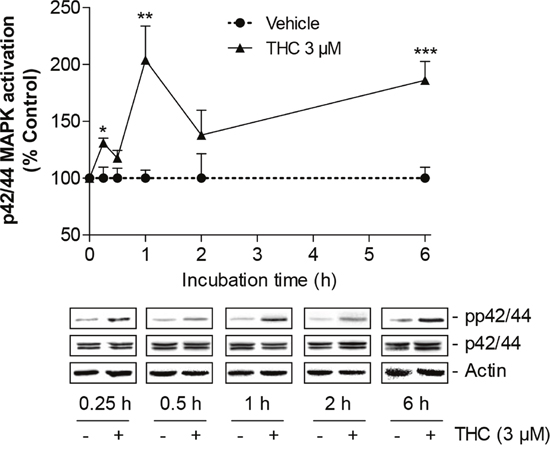 Figure 3: Time-course of p42/44 MAPK activation by THC in MSCs. Western blot analysis of p42/44 MAPK activation in MSCs treated with 3 μM THC or vehicle over a 6-h incubation period. The time-course graph above the representative blots indicates densitometric analysis of phospho-p42/44 normalized to p42/44 MAPK. Data are expressed as percentage of vehicle-treated controls (set as 100%) and represent means ± SEM of n = 3 incubations with cells from 1 donor with the exception of the 1- and 2-h values where data were calculated from n = 6 incubations with cells from 2 donors (3 incubations per donor). *P < 0.05, **P < 0.01, ***P < 0.001 vs. corresponding vehicle control, Student’s t test.