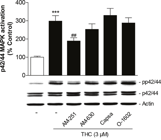 Figure 5: Role of cannabinoid-modulated receptors as upstream targets of p42/44 MAPK activation by THC in MSCs. Cells were pretreated for 1 h with AM-251 (CB1 antagonist), AM-630 (CB2 antagonist), capsazepine (Capsa, TRPV1 antagonist) or O-1602 (agonist at GPR55) at 1-μM concentrations prior to addition of vehicle or 3 μM THC for another 1 h. Activation of p42/44 MAPK was analyzed by Western blot analyses. The histogram above the representative blots indicates densitometric analysis of phospho-p42/44 normalized to p42/44 MAPK. Data are expressed as percentage of vehicle-treated controls (set as 100%) and represent means ± SEM of n = 17 incubations with cells from 5 donors (3 to 4 incubations per donor). ***P < 0.001, vs. vehicle control; ##P < 0.01 vs. cells treated with THC, one-way ANOVA plus post hoc Bonferroni test.