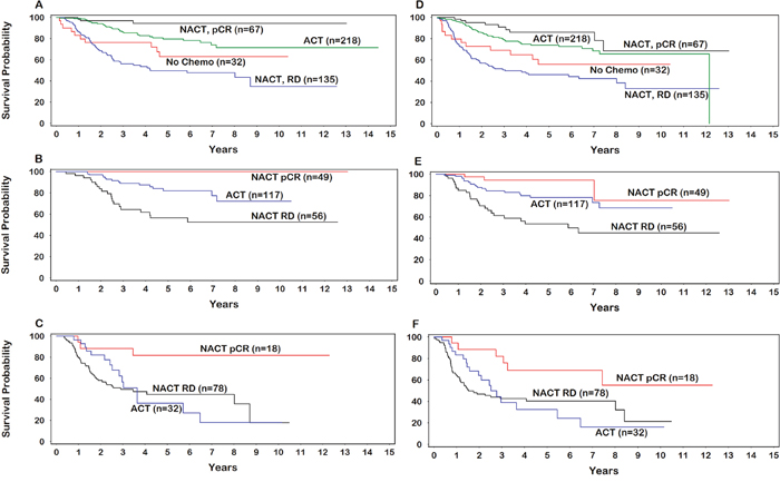 Figure 1: Overall survival (A. all patients; B. stage II; C. stage III), Disease-free survival (D. all patients; E. stage II; F. stage III). ACT=adjuvant chemotherapy; NACT=neoadjuvant chemotherapy; pCR=pathological complete response; RD=residual disease.
