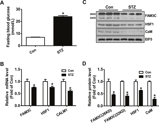 Figure 1: FAM3C-HSF1-CaM pathway was repressed in type 1 diabetic mouse livers. (A) Fasting blood glucose levels of mice were markedly elevated at 1 month post STZ injection. (B) The mRNA levels of FAM3C, HSF1 and CALM1 were reduced in diabetic mouse livers. (C-D) The protein levels of FAM3C, HSF1 and CaM were reduced in diabetic mouse livers. The representative gel images were shown in panel C, and quantitative data in panel D. Con, control mice treated with saline; STZ, mice treated with STZ. N=6-8, *P<0.05 versus control mice.
