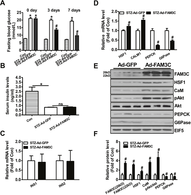 To directly evaluate the effects of FAM3C-HSF1-CaM pathway on hepatic gluconeogenesis and hyperglycemia of type 1 diabetic mice, FAM3C or HSF1 was overexpressed in STZ-treated mouse livers via tail vein injection of Ad-FAM3C or HSF1 plasmid. At 3 and 7 days post Ad-FAM3C injection, the fasting blood glucose levels were significantly reduced when compared with mice treated with Ad-GFP (Figure 2A). Particularly, injection of Ad-FAM3C almost reduced the fasting blood glucose levels of diabetic mice to that of normal mice post 7 days (Figure 2A). The serum insulin levels between Ad-GFP- and Ad-FAM3C-treated mice were not different (Figure 2B). The mRNA levels of insulin genes in Ad-GFP- and Ad-FAM3C-treated mouse pancreas were also not different (Figure 2C). Injection of Ad-FAM3C increased the mRNA levels of HSF1 and CALM1, while reduced that of PEPCK and G6Pase in diabetic mouse livers (Figure 2D). Injection of Ad-FAM3C increased both FAM3C protein isoforms in diabetic mouse livers (Figure 2E-2F). FAM3C overexpression increased the protein levels of HSF1, CaM and phosphorylated Akt (pAkt) with the reduced PEPCK and G6Pase protein levels in type 1 diabetic mouse livers (Figure 2E-2F).