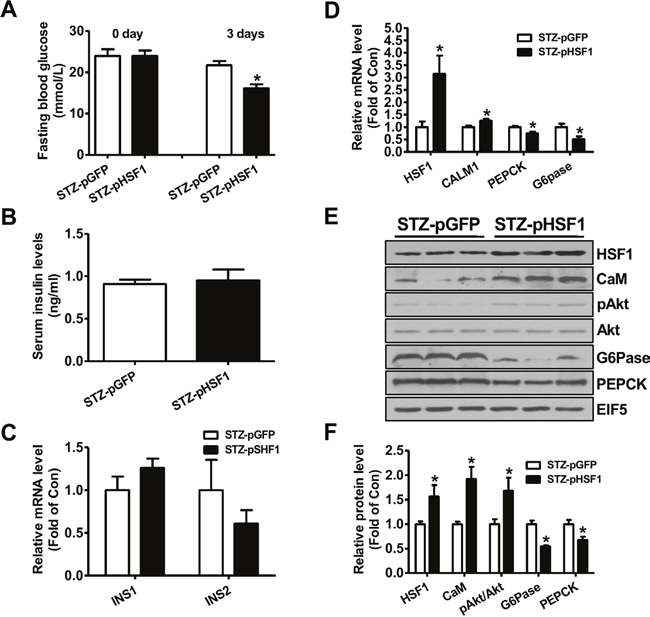At 3 days post HSF1 plasmid injection, the fasting blood glucose levels were decreased when compared with diabetic mice treated with pGFP plasmid (Figure 3A). Injection of HSF1 plasmid had little effect on serum insulin levels and insulin gene expression in pancreas (Figure 3B-3C). Injection of HSF1 plasmid increased the mRNA levels of HSF1 and CALM1, while reduced that of PEPCK and G6Pase in type 1 diabetic mouse livers (Figure 3D). HSF1 overexpression increased the protein levels of CaM and pAkt but decreased that of PEPCK and G6Pase in diabetic mouse livers (Figure 3E-3F). Overall, the changes in hepatic Akt phosphorylation and gluconeogenic gene expression were consistent with the amelioration of hyperglycemia after FAM3C or HSF1 overexpression.