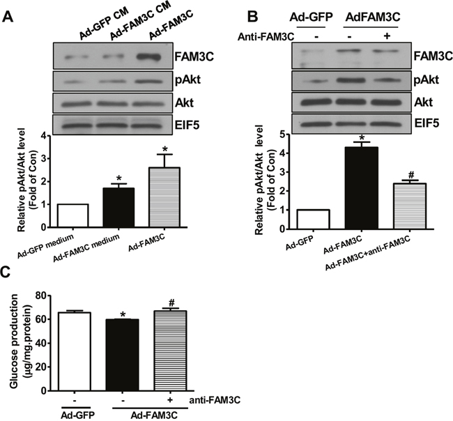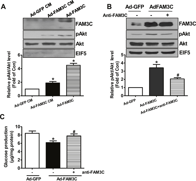 Figure 5: Secretion is imporant for FAM3C-induced Akt activation and gluconeogenesis repression in primary mouse hepatocytes. (A) Conditioned medium of Ad-FAM3C-infected cells induced Akt phosphorylation in primary mouse hepatocytes. Mouse hepatocytes were treated with conditioned medium of Ad-GFP- or Ad-FAM3C-infected hepatocytes for 24 hours before Akt phosphorylation was assayed. Ad-FAM3C-infected hepatocytes was used as a positive control. N=3, *P<0.05 versus cells treated with conditioned medium of Ad-GFP-infected cells. (B) Treatment with anti-FAM3C antibodies inhibited Akt activation induced by FAM3C overexpression in primary mouse hepatocytes. (C) Treatment with anti-FAM3C antibodies reversed FAM3C-induced repression on gluconeogenesis in primary mouse hepatocytes. CM, conditioned medium. N=4, *P<0.05 versus Ad-GFP-infected cells, #P<0.05 versus Ad-FAM3C-infected cells.