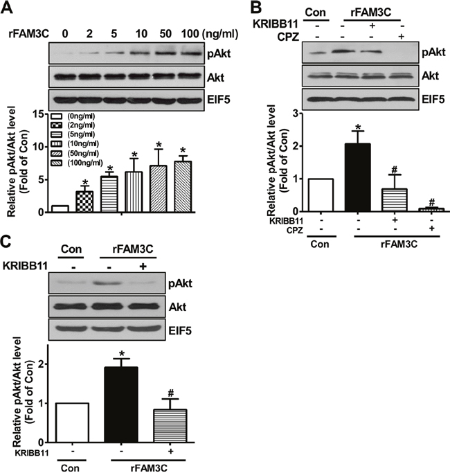 Figure 6: rFAM3C induced Akt phosphorylation in hepatocytes. (A) rFAM3C dose-dependently induced Akt activation in HepG2 cells. Cells were treated with various concentration of rFAM3C for 24 hours. (B) rFAM3C induced Akt activation in HSF1- and CaM-dependent manner in HepG2 cells. Cells were treated with 5ng/ml rFAM3C for 24 hours. (C) rFAM3C induced Akt activation in HSF1-dependent manner in primary mouse hepatocytes. Hepatocytes were treated with 5ng/ml rFAM3C for 24 hours. The treatment of inhibitors was detailed in the experimental procedure. Con, control cells; rFAM3C, cells treated with rFAM3C. rFAM3C, recombinant human FAM3C protein. N=4, *P<0.05 versus control cells, #P<0.05 versus rFAM3C-treated cells without inhibitors.