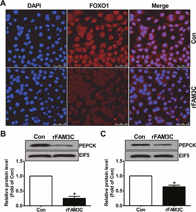 Figure 7: rFAM3C inactivated FOXO1 and repressed gluconeogenic gene expression in hepatocytes. Cells were treated with 5ng/ml rFAM3C for 24 hours. (A) rFAM3C promoted the nuclear exclusion of FOXO1 in HepG2 cells. The images were the representatives of 3 experiments. (B) rFAM3C reduced PEPCK protein level in HepG2 cells. (C) rFAM3C reduced PEPCK protein level in primary mouse hepatocytes. Con, control cells; rFAM3C, cells treated with rFAM3C. N=4-5, *P<0.05 versus control cells.