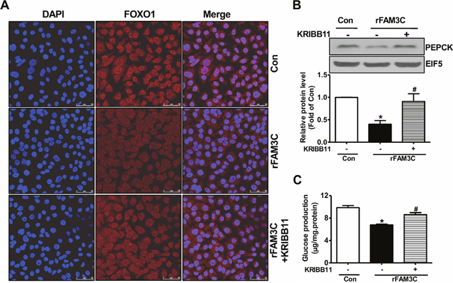 Figure 8: rFAM3C inactivated FOXO1 and repressed gluconeogenic gene expression in HSF1-dependent manner. Cells were treated with 5ng/ml rFAM3C for 24 hours in the absence or presence of KRIBB11. (A) rFAM3C promoted the nuclear exclusion of FOXO1 in HSF1-dependent manner in HepG2 cells. The images were the representatives of 3 experiments. (B) rFAM3C repressed PEPCK protein expression in HSF1-dependent manner in HepG2 cells. (C) rFAM3C repressed gluconeogenesis in HSF1-dependent manner in HepG2 cells. Con, control cells; rFAM3C, cells treated with rFAM3C. N=4-5, *P<0.05 versus control cells, #P<0.05 versus rFAM3C-treated cells without inhibitor.
